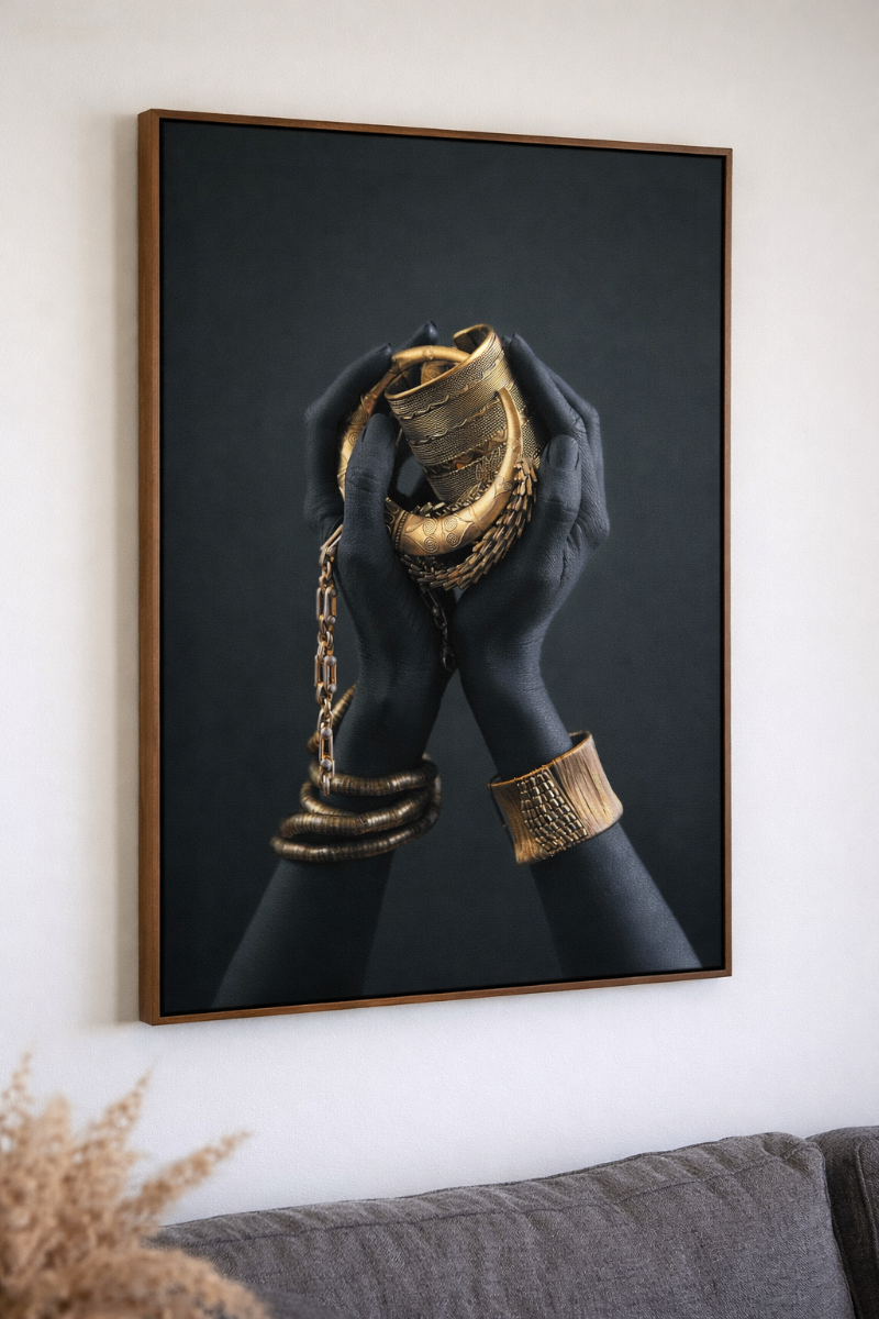 Celebrate African beauty and elegance with this stunning wall art featuring a sophisticated portrait adorned with luxurious golden jewelry. The rich contrast between the dark background and gold creates a powerful statement piece that brings cultural pride and artistic sophistication to any space. Perfect for modern interiors, living rooms, or as a meaningful gift that honors African heritage and beauty.